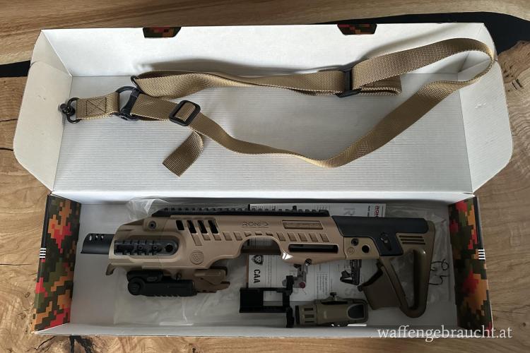 Lieferumfang: Roni Schaftsystem, Klappgriff, Schienen, Wangenauflage, Licht und One-Point-Sling