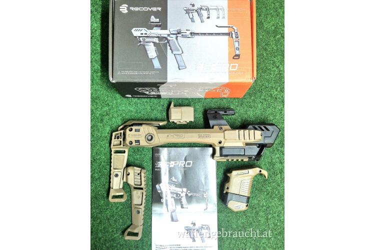 Nahezu neuer S-PRO Anschlagschaft für Glock Pistolen zu verkaufen, das neueste Produkt aus dem Hause Recover Tactical. Hier im Full Kit mit Optik Brücke für Red Dot Visiere und Vordergriff (zeitgleich Halter für zusätzliches Magazin).