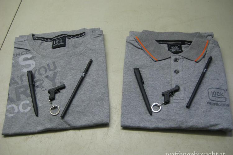 1 Stk. Glock Polo G 17 Perfektion Men Gr. XL, 1 Stk. Glock T-Shirt Gr. XL, 2 Stk. Glock Kugelschreiber, 2 Stk. Glock Bleistifte, 2 Stk. Glock Schlüsselanhänger, Bei Fragen Handy Nr. 0676 9373888 € 50,--