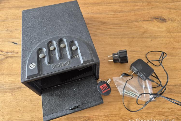 Safe mit elektronischer Schnellöffnung per Tastencode. Ideal zur sicheren Aufbewahrung von Kurzwaffe, Munition oder Wertgegenständen. Mit dabei sind Notöffnungsschlüssel, Netzteil, Steckeradapter und Befestigungsmaterial. Gebrauchter Zustand mit normalen Gebrauchsspuren, voll funktionstüchtig.
