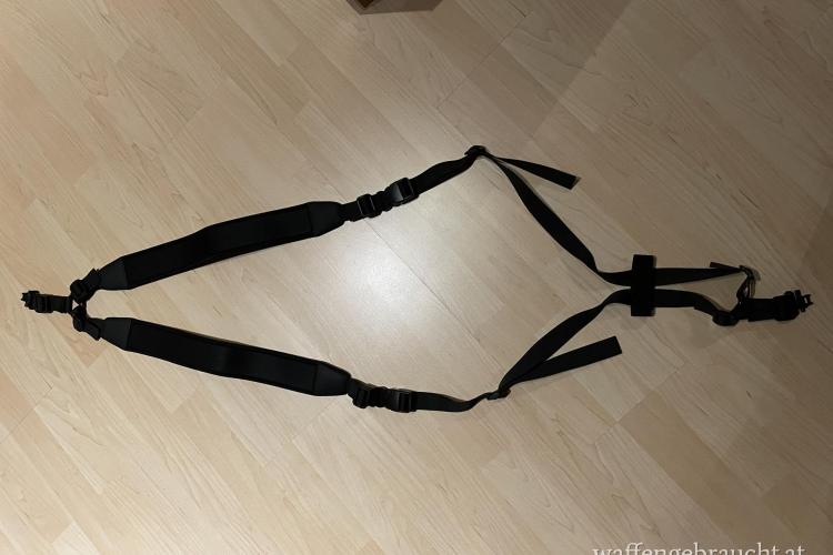Diesen Gurt kann man einerseits als quasi Rucksack-Schultergurt verwenden, dass das Gewehr/die Flinte/die Armbrust in der Mitte am Rücken getragen werden kann, oder andererseits kann man aus diesem Schultergurt zwei einfache Schulterriemen machen - also aus 1 mach 2!