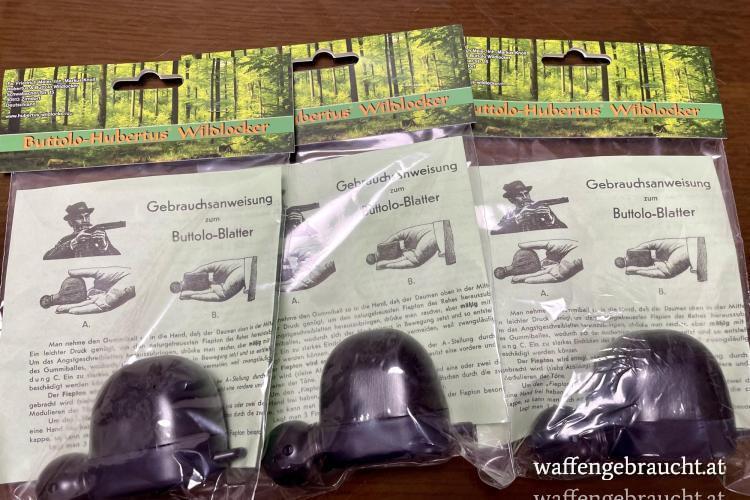 Original Buttolo-Rehblatter zur Nachahmung für Fieptöne der Ricke oder Kitz sowie Sprengruf oder Angstgeschrei des Rehbocks. Gummibalg (Material Naturkautschuk). Mit Anleitung.