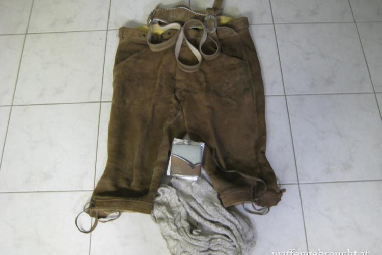 Trachtenkniebundhose aus Ziegenleder Bundumfang 103 cm inkl. Hosenträger und Trachtenstutzen Gr. 42-43 Kniebundhose Länge 73 cm. 1 Stk. Flachmann. Bei Fragen Handy Nr. 0676 9373888 € 60,--