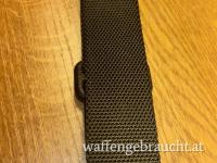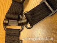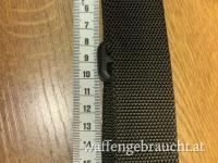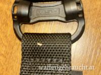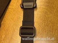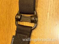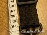 Schwarzer unbenutzter Trageriemen für Sturmgewehre. Breite 3,2 cm. Dieser variable Riemen kann mittels Druckknopfarretierung einfach von Two point auf One point umgerüstet werden.