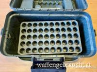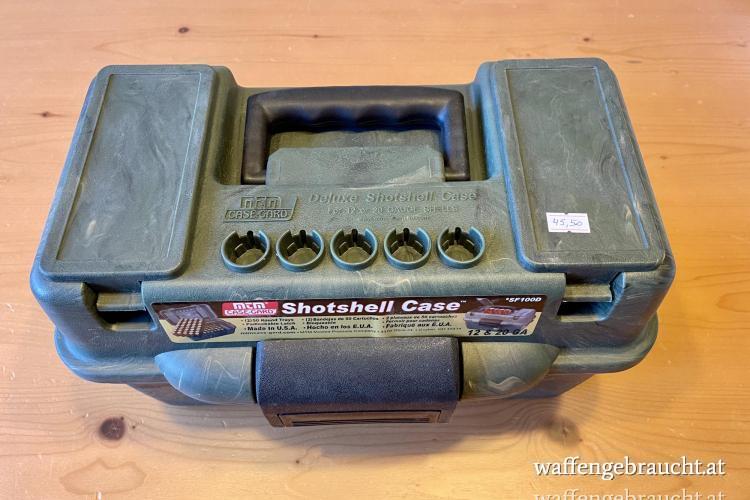 Die MTM Patronenbox erscheint als robuster Kunststoffbehälter mit einem Fassungsvermögen von 100 Schrotpatronen im Kaliber 12/70.