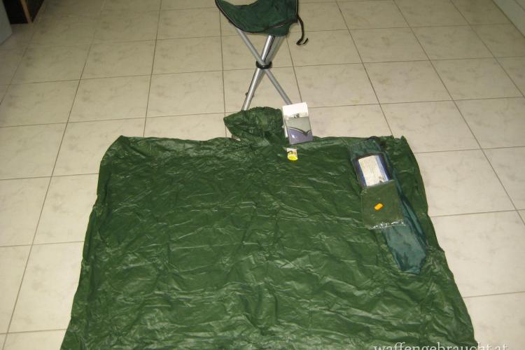1 Stk. Alu-Dreibein H/B/L 48x33x33, 1 Stk. Regenponcho, 1 Stück Flachmann, 1 Paar Ohrenstöpsel.