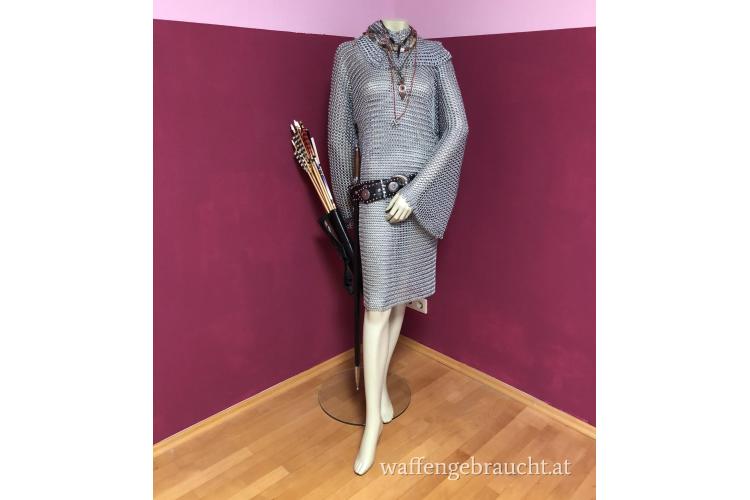 Kettenhemd trägte eine originale Schaufensterpuppe, weiblich, Arme und Hände beweglich und aushängbar, auf einem Glasfuß, steht von alleine, sowie einen weiblichen Perückenkopf evtl. für Single-Kopfdarstellung der Kettenhaube (Kann auf dem Puppen Rumpf montiert werden)