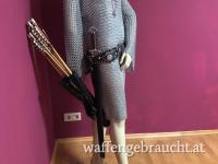Massive Ausführung (ca. 12 KG) mit reichhaltigen, authentischen Beimaterial für Ritterfeste, Aufführungen, Komparsen+++ Darstellung auch als "Jean d´arc" für Frauen möglich. Schwert mit hochwertiger Klinge, für Schaukampf geeignet (nicht Scharf) Bogenköcher mit 16 Stück handgefertigen, funktionstüchtigen Langbogenpfeilen und Lederhandschutz.