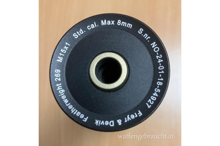 Schalldämpfer Freyr_Devik Featherweight 269 für bis 8mm und Gewinde M15:1 in einem guten Zustand. Verkauf nur an Berechtigte (gültiger Jagdschein).