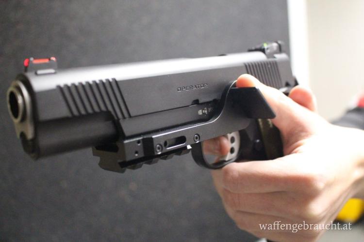 Durch die zusätzliche Abstützung mit dem Daumen liegt die Waffe sehr ruhig in der Hand.