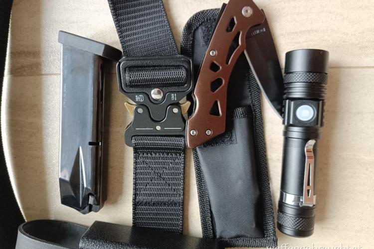 Takt. Gürtel komplett mit 2 Stk Beretta 18 Rd Magazinen für 92er Serie (M9A3, 92x), 2 Stk ABS Magazinholster, taktischer LED Taschenlampe, taktischem Kugelschreiber aus Metall sowie einem Taschenmesser mit Fixierung und Tasche zu verkaufen! Alternativ mit Magazinholster aus Leder für kleinere Magazine auf Anfrage. Nur als Set, keine Einzelabgabe!